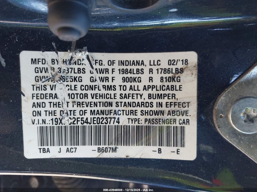 2018 HONDA CIVIC - 19XFC2F54JE023774, цвет - Черный, 2.0, Бензин, Передний привод из США