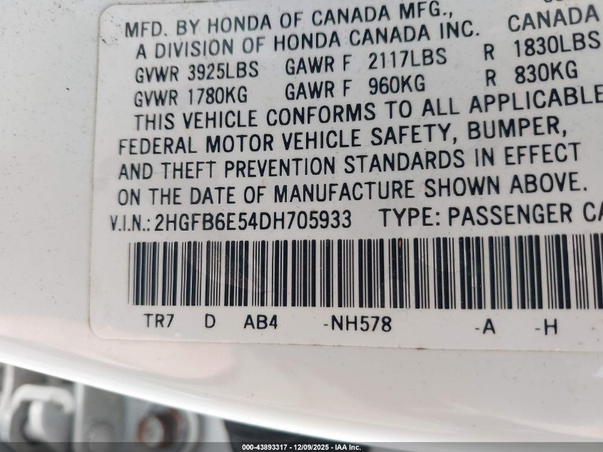 2013 HONDA CIVIC - 2HGFB6E54DH705933, цвет - Белый, 2.4, Бензин, Передний привод из США