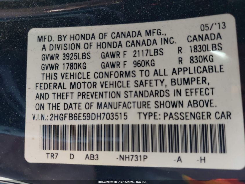 2013 HONDA CIVIC - 2HGFB6E59DH703515, цвет - Черный, 2.4, Бензин, Передний привод из США