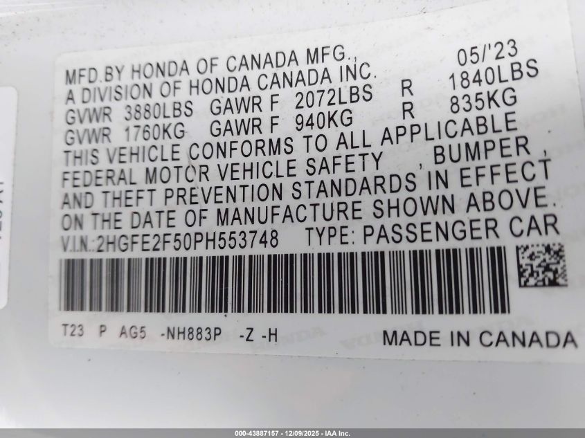 2023 HONDA CIVIC - 2HGFE2F50PH553748, цвет - Белый, 2.0, Бензин, Передний привод из США