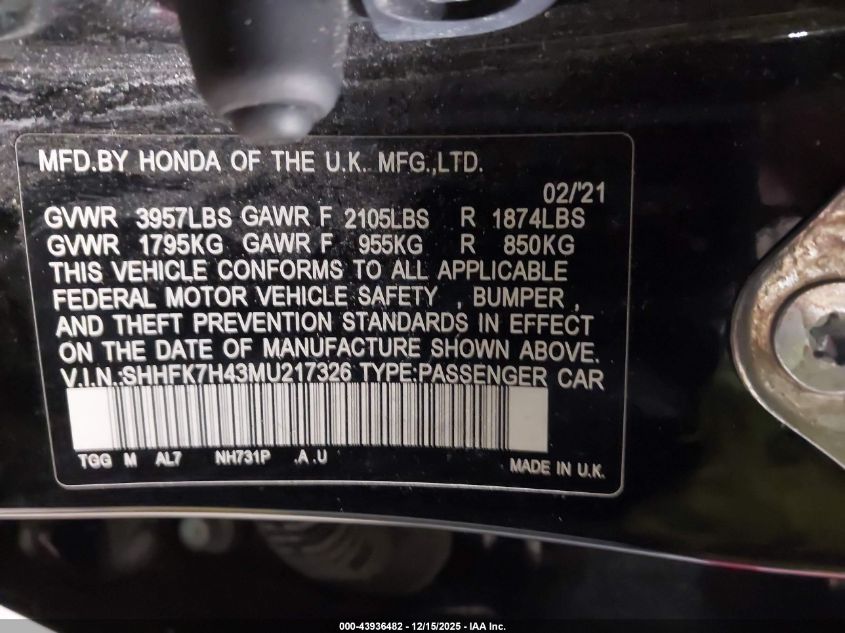 2021 HONDA CIVIC - SHHFK7H43MU217326, цвет - Черный, 1.5, Бензин, Передний привод из США