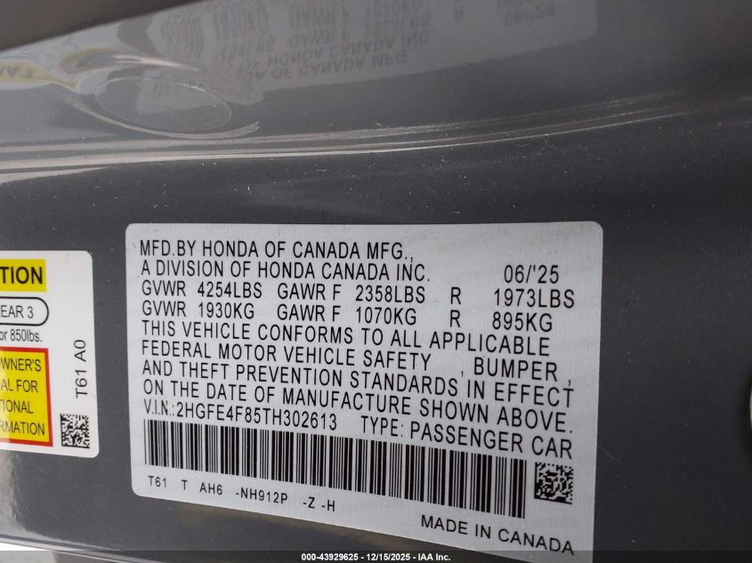 2026 HONDA CIVIC - 2HGFE4F85TH302613, цвет - , 2.0, Гибрид, Передний привод из США
