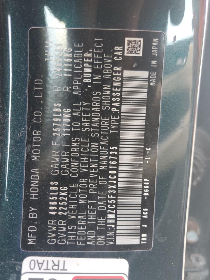 2018 HONDA CLARITY - JHMZC5F3XJC016735, цвет - Зеленый, 1.5, Гибрид, из США