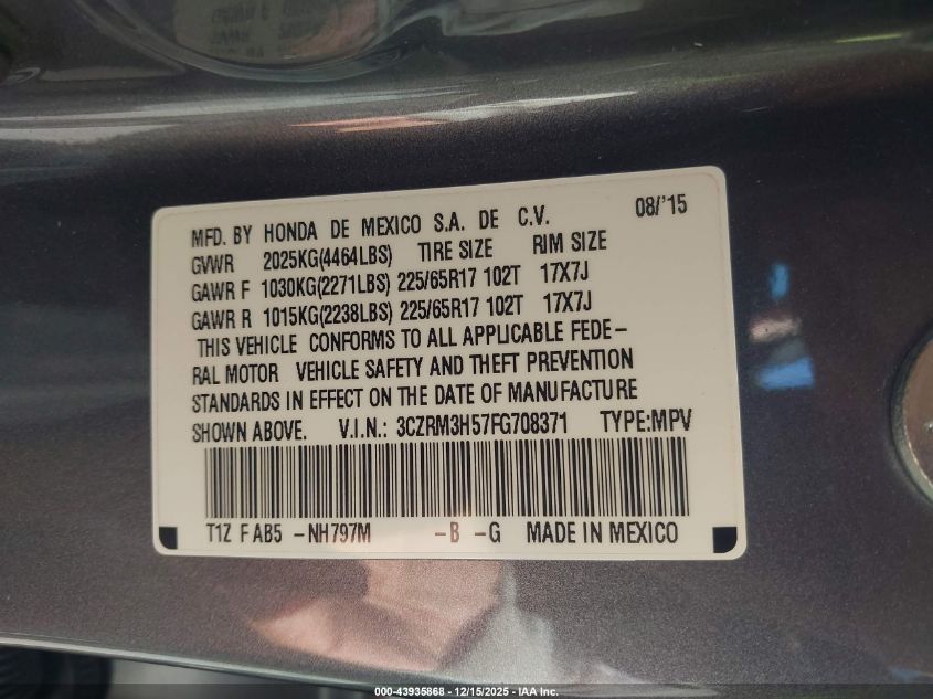 2015 HONDA CR-V - 3CZRM3H57FG708371, цвет - Серый, 2.4, Бензин, Передний привод из США