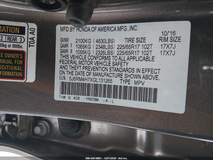 Цвет СерыйЦилиндры 4Привод Полный приводVIN 5J6RM4H7XGL131265Состояние Заводится и едет (проверено)Повреждения Передняя или задняя