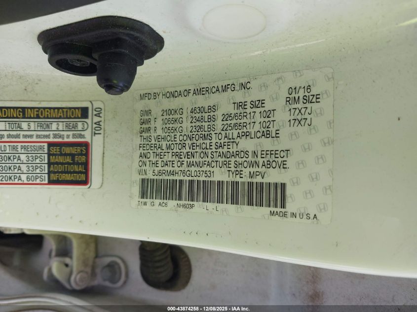 2016 HONDA CR-V - 5J6RM4H76GL037531, цвет - Белый, 2.4, Бензин, Полный привод из США