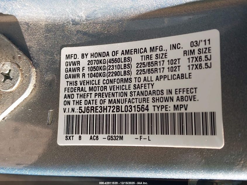 2011 HONDA CR-V - 5J6RE3H72BL031564, цвет - Зеленый, 2.4, Бензин, Передний привод из США