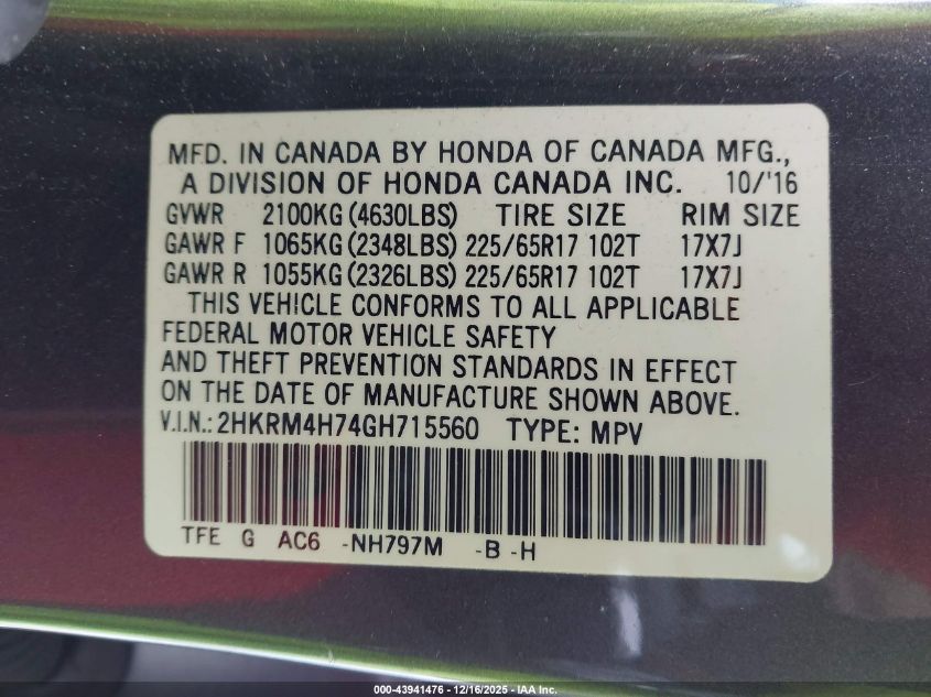 2016 HONDA CR-V - 2HKRM4H74GH715560, цвет - Серый, 2.4, Бензин, Полный привод из США