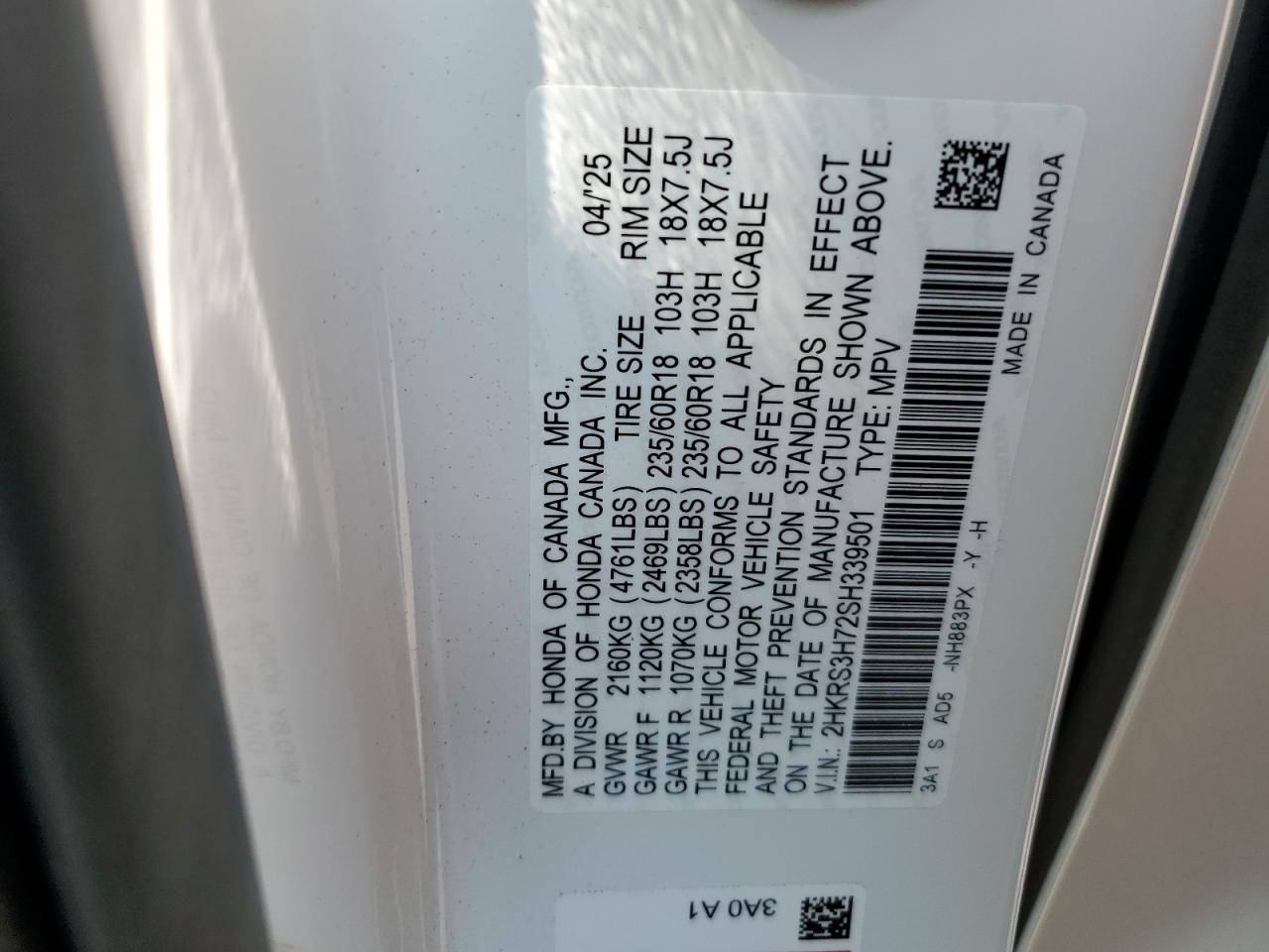 2025 HONDA CR-V - 2HKRS3H72SH339501, цвет - Белый, 1.5, Бензин, из США