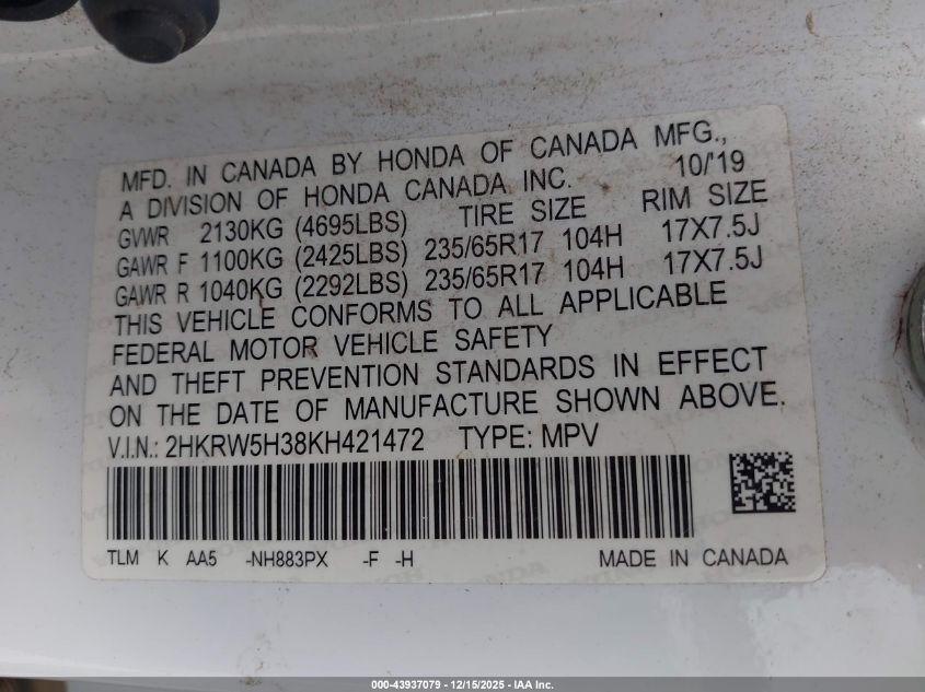 2019 HONDA CR-V - 2HKRW5H38KH421472, цвет - Белый, 2.4, Бензин, Передний привод из США
