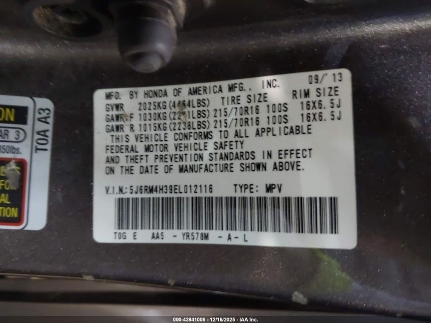 Цвет СерыйЦилиндры 4Привод Полный приводVIN 5J6RM4H39EL012116Состояние СтационарноПовреждения Передняя правая