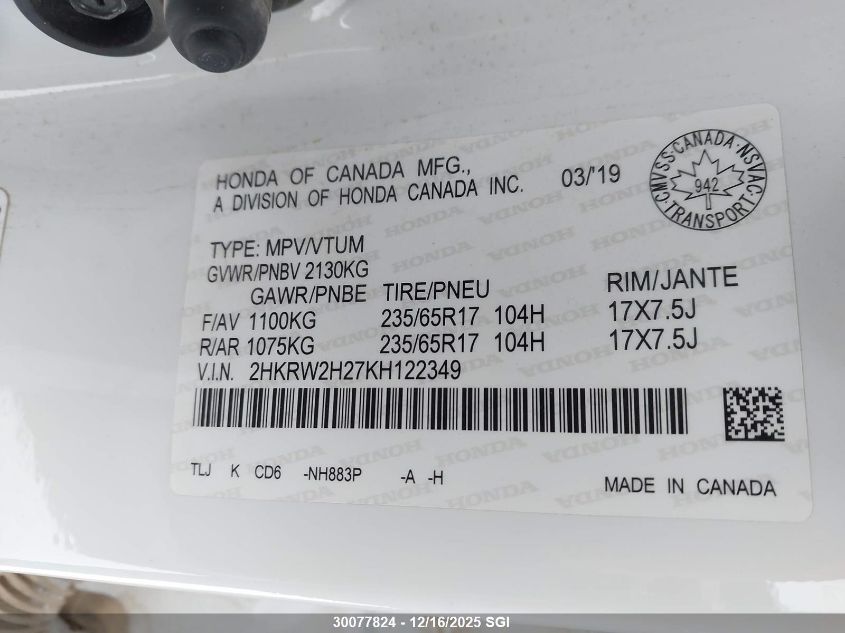2019 HONDA CR-V - 2HKRW2H27KH122349, цвет - Белый, , Бензин, Полный привод из США