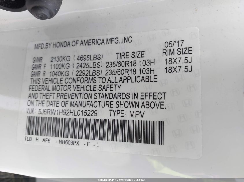 2017 HONDA CR-V - 5J6RW1H92HL015229, цвет - Белый, 1.5, Бензин, Передний привод из США