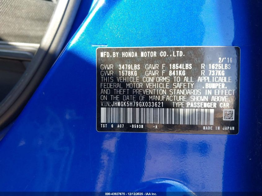 2016 HONDA FIT - JHMGK5H79GX033621, цвет - Синий, 1.5, Бензин, Передний привод из США
