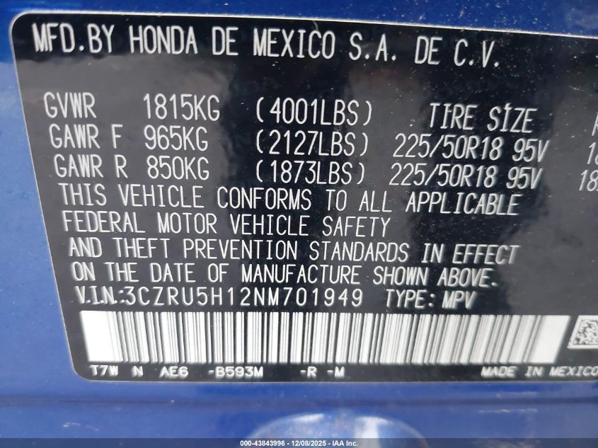 2022 HONDA HR-V - 3CZRU5H12NM701949, цвет - Синий, 1.8, Бензин, Передний привод из США