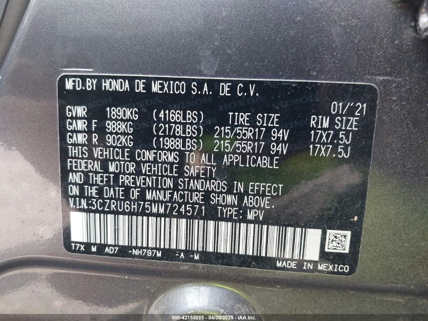 2021 HONDA HR-V - 3CZRU6H75MM724571, цвет - Серый, 1.8, Бензин, Полный привод из США