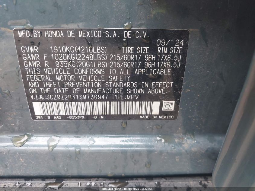 2025 HONDA HR-V - 3CZRZ2H31SM736947, цвет - Синий, 2.0, Бензин, Полный привод из США
