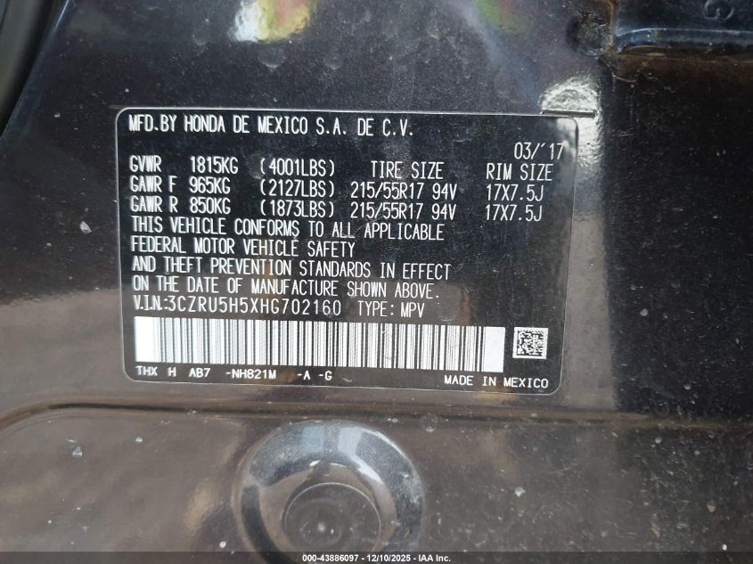 2017 HONDA HR-V - 3CZRU5H5XHG702160, цвет - Черный, 1.8, Бензин, Передний привод из США