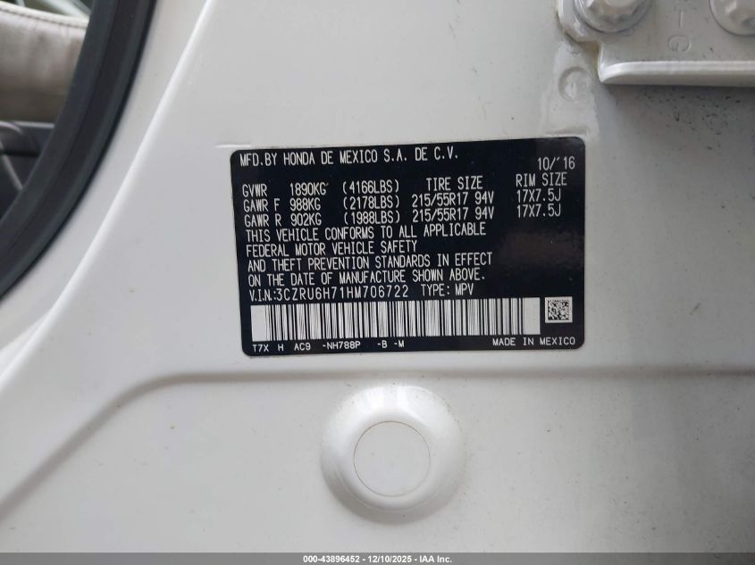 2017 HONDA HR-V - 3CZRU6H71HM706722, цвет - Белый, 1.8, Бензин, Полный привод из США