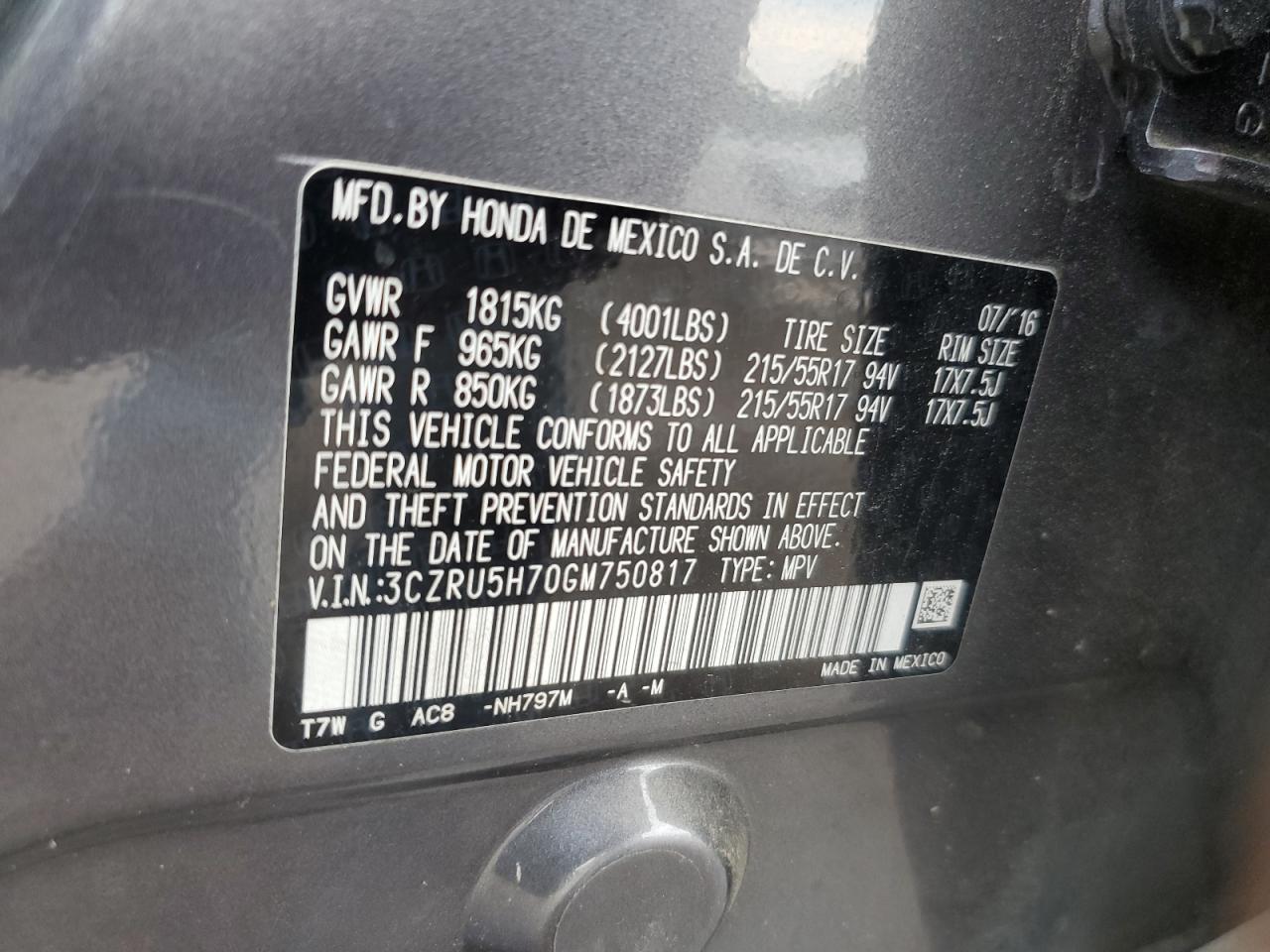 2016 HONDA HR-V - 3CZRU5H70GM750817, цвет - Серый, 1.8, Бензин, из США