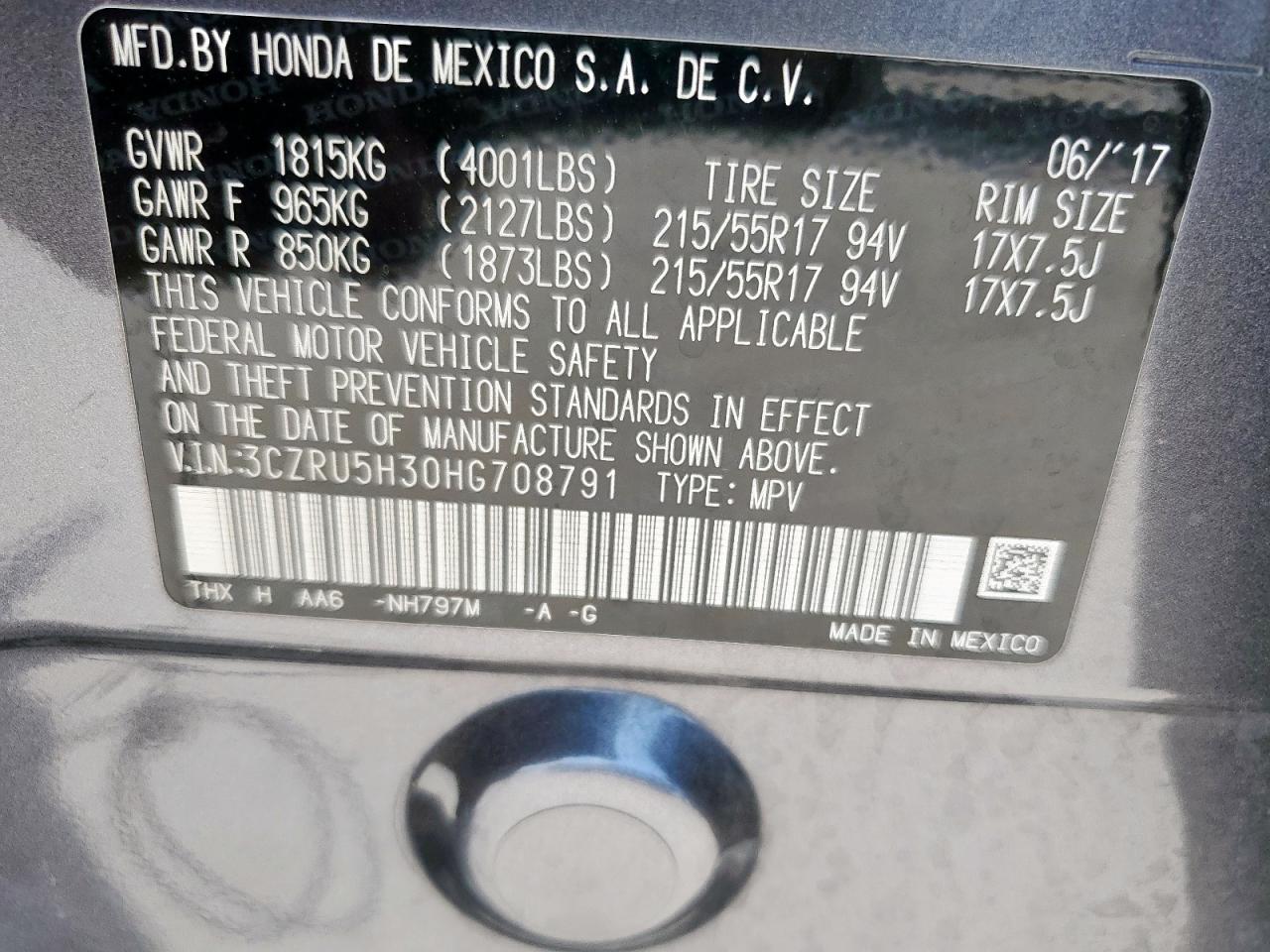 2017 HONDA HR-V - 3CZRU5H30HG708791, цвет - Древесный уголь, 1.8, Бензин, из США