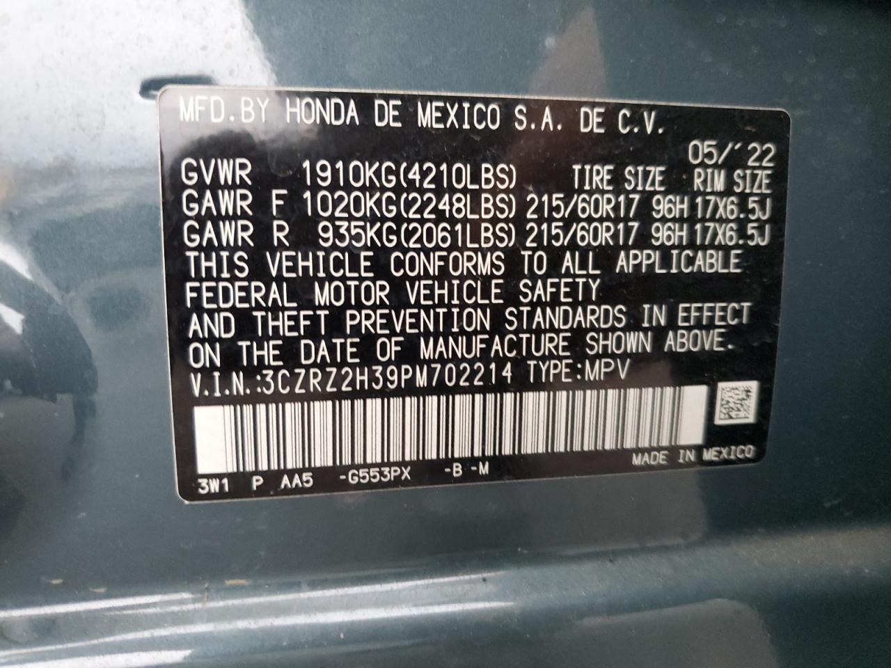 2023 HONDA HR-V - 3CZRZ2H39PM702214, цвет - Синий, 2.0, Бензин, Полный привод из США