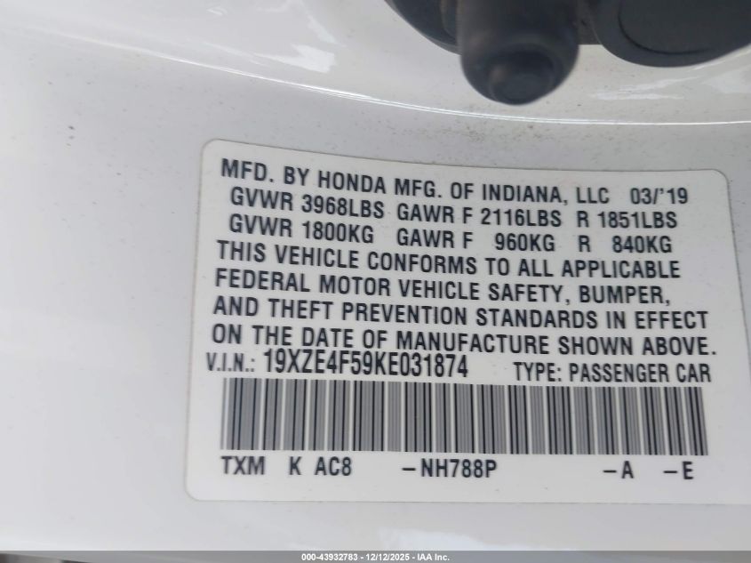 2019 HONDA INSIGHT - 19XZE4F59KE031874, цвет - Белый, 1.5, Гибрид, Передний привод из США