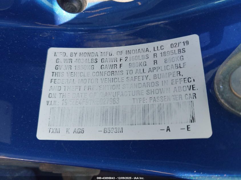 2019 HONDA INSIGHT - 19XZE4F91KE027983, цвет - Синий, 1.5, Гибрид, Передний привод из США