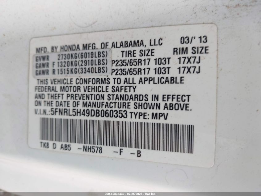 Цвет БелыйЦилиндры 6Привод Передний приводVIN 5FNRL5H49DB060353Состояние СтационарноПовреждения По всему авто
