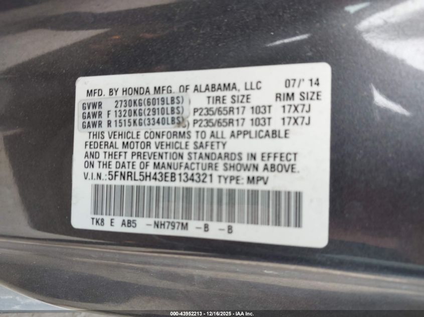 Цвет СерыйЦилиндры 6Привод Передний приводVIN 5FNRL5H43EB134321Состояние НеизвестноПовреждения Задняя правая