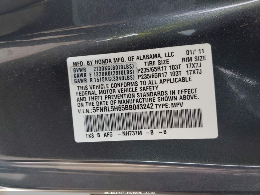 Цвет СерыйЦилиндры 6Привод Передний приводVIN 5FNRL5H65BB043242Состояние Заводится и едет (проверено)Повреждения Передняя или задняяДата аукциона 2025-12-17