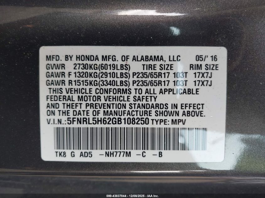 Цвет СерыйЦилиндры 6Привод Передний приводVIN 5FNRL5H62GB108250Состояние Заводится и едет (проверено)Повреждения Передняя или задняя