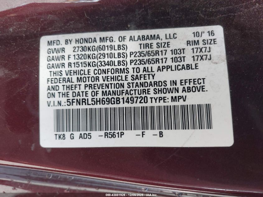 2016 HONDA ODYSSEY - 5FNRL5H69GB149720, цвет - Бургундия, 3.5, Бензин, Передний привод из США