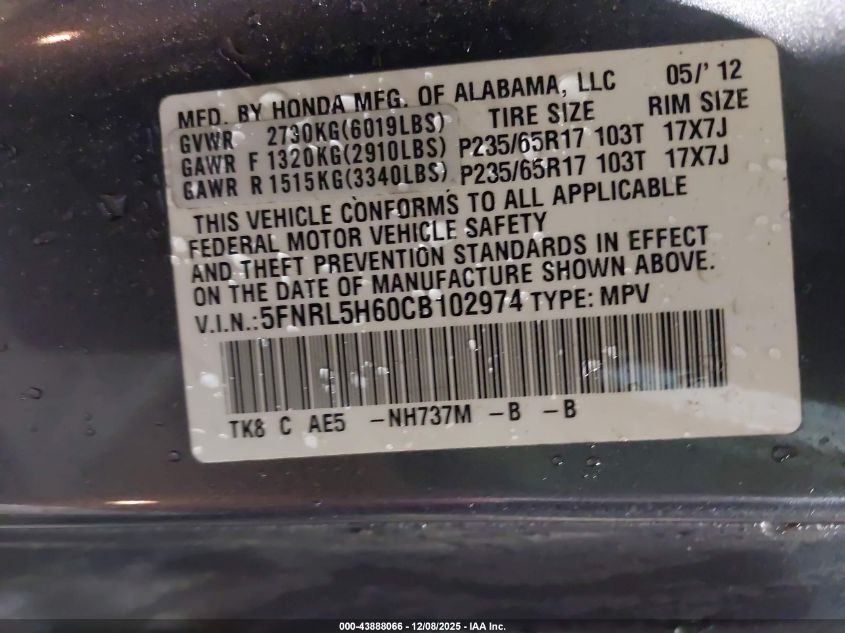 Цвет СерыйЦилиндры 6Привод Передний приводVIN 5FNRL5H60CB102974Состояние Заводится и едет (проверено)Повреждения Задняя