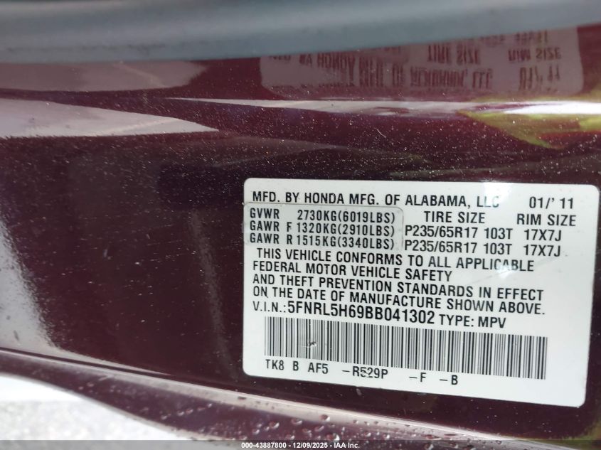 Цвет БордовыйЦилиндры 6Привод Передний приводVIN 5FNRL5H69BB041302Состояние Заводится и едет (проверено)Повреждения Передняя или задняя