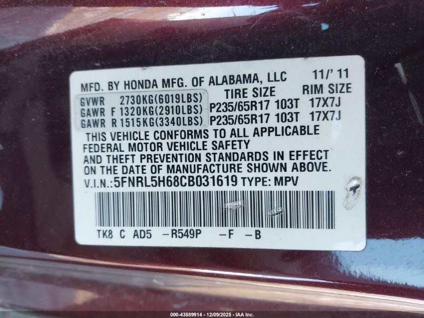 Цвет БордовыйЦилиндры 6Привод Передний приводVIN 5FNRL5H68CB031619Состояние СтационарноПовреждения Передняя или задняя
