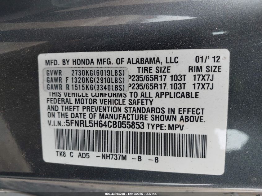 Цвет СерыйЦилиндры 6Привод Передний приводVIN 5FNRL5H64CB055853Состояние Заводится и едет (проверено)Повреждения Правая сторона