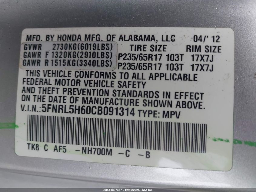 Цвет СеребряныйЦилиндры 6Привод Передний приводVIN 5FNRL5H60CB091314Состояние Заводится и едет (проверено)Повреждения Передняя или задняя