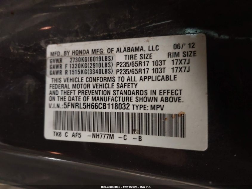 Цвет СерыйЦилиндры 6Привод Передний приводVIN 5FNRL5H66CB118032Состояние Заводится и едет (проверено)Повреждения Передняя или задняя
