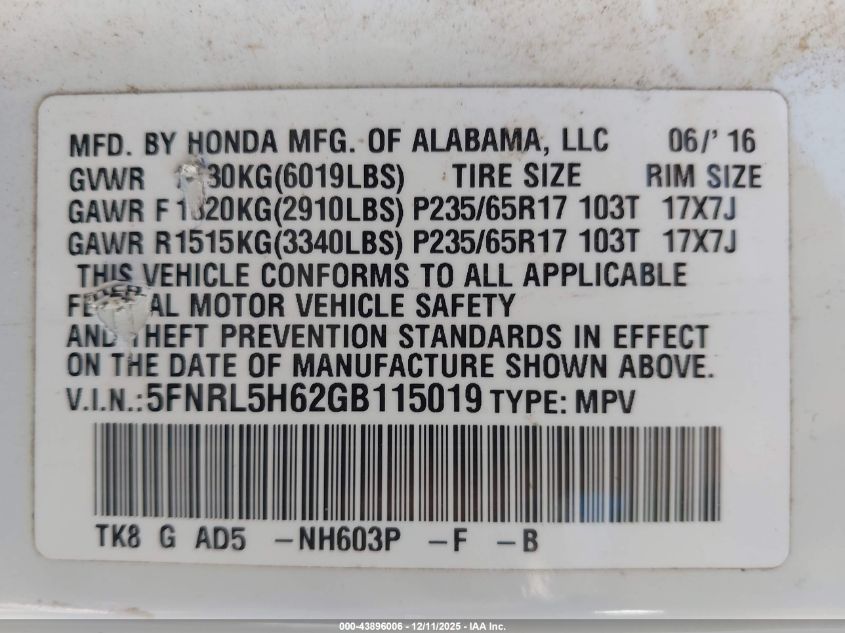 Цвет БелыйЦилиндры 6Привод Передний приводVIN 5FNRL5H62GB115019Состояние Заводится и едет (проверено)Повреждения Передняя или задняя