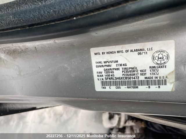 Цвет СерыйЦилиндры 6Привод Передний приводVIN 5FNRL5H6XCB501472Состояние СтационарноПовреждения ПередняяДата аукциона 2025-12-17