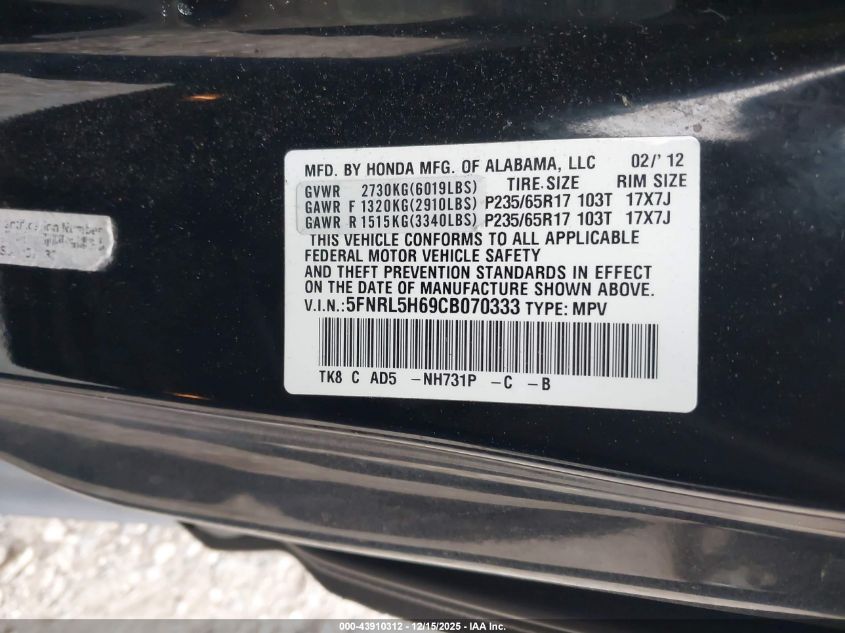 Цвет ЧерныйЦилиндры 6Привод Передний приводVIN 5FNRL5H69CB070333Состояние Заводится и едет (проверено)Повреждения Левая сторона