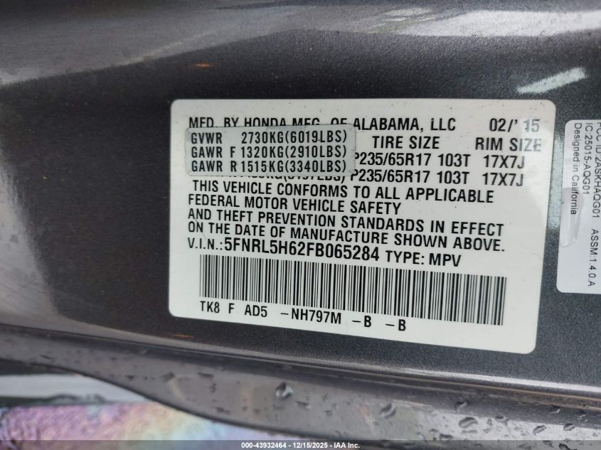 Цвет СерыйЦилиндры 6Привод Передний приводVIN 5FNRL5H62FB065284Состояние СтационарноПовреждения Передняя или задняя