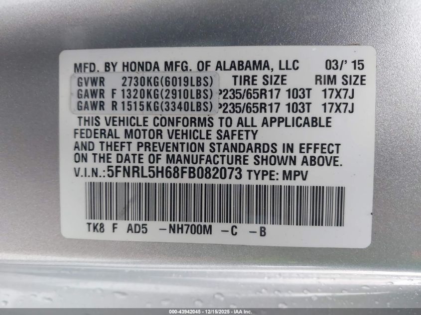 2015 HONDA ODYSSEY - 5FNRL5H68FB082073, цвет - Серебряный, 3.5, Бензин, Передний привод из США