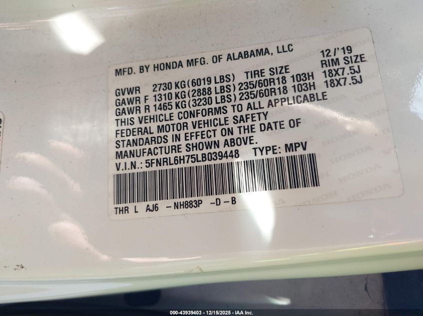 Цвет БелыйЦилиндры 6Привод Передний приводVIN 5FNRL6H75LB039448Состояние СтационарноПовреждения Передняя левая