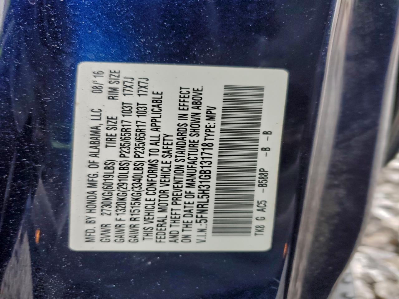 Цвет СинийЦилиндры 6VIN 5FNRL5H31GB131718Состояние Заводится и едет (проверено)Повреждения Задняя