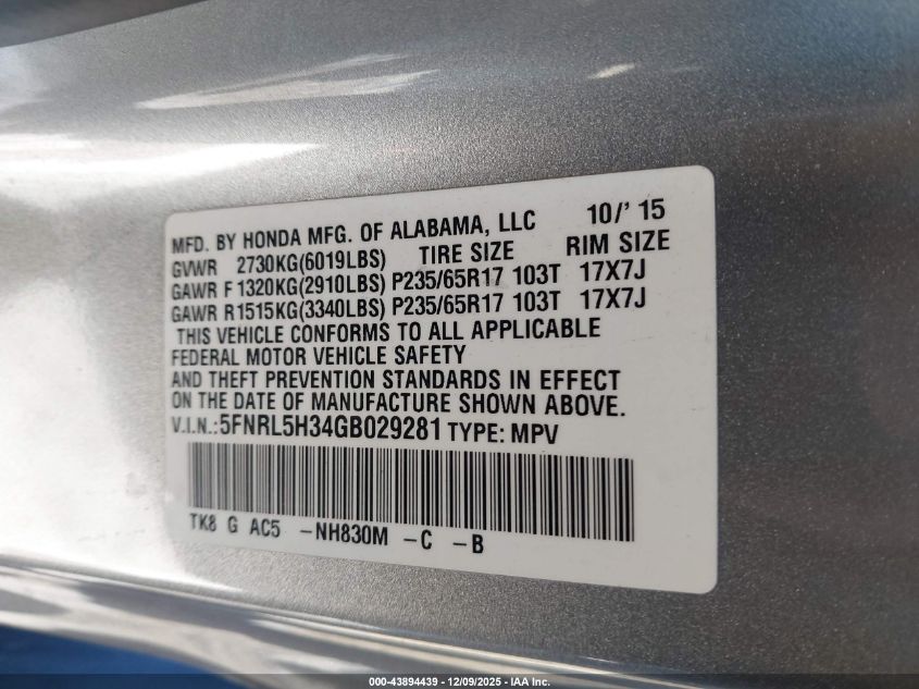 Цвет СерыйЦилиндры 6Привод Передний приводVIN 5FNRL5H34GB029281Состояние Заводится и едет (проверено)Повреждения Задняя правая