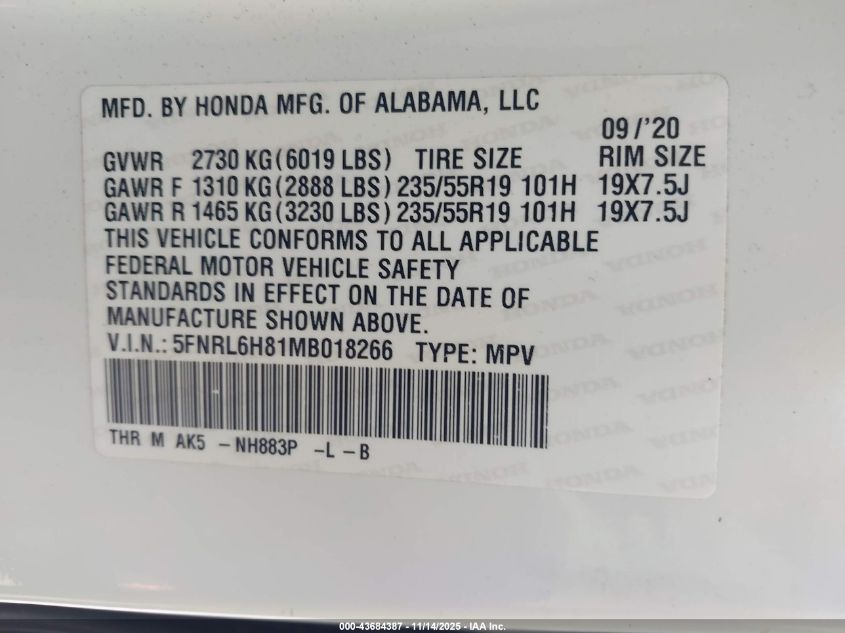2021 HONDA ODYSSEY - 5FNRL6H81MB018266, цвет - Белый, 3.5, Бензин, Передний привод из США