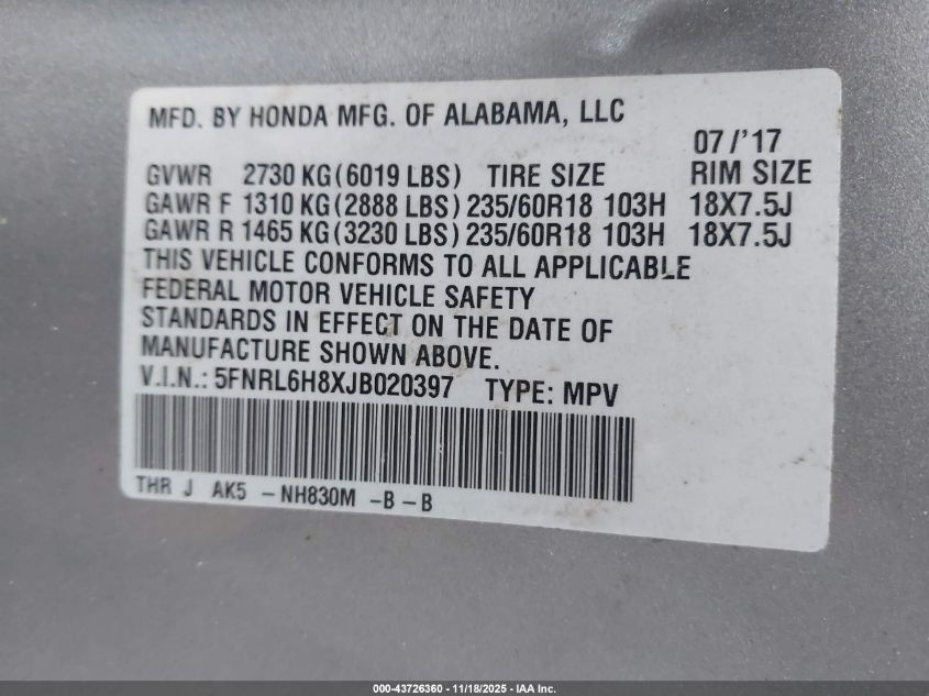 2018 HONDA ODYSSEY - 5FNRL6H8XJB020397, цвет - Серебряный, 3.5, Бензин, Передний привод из США