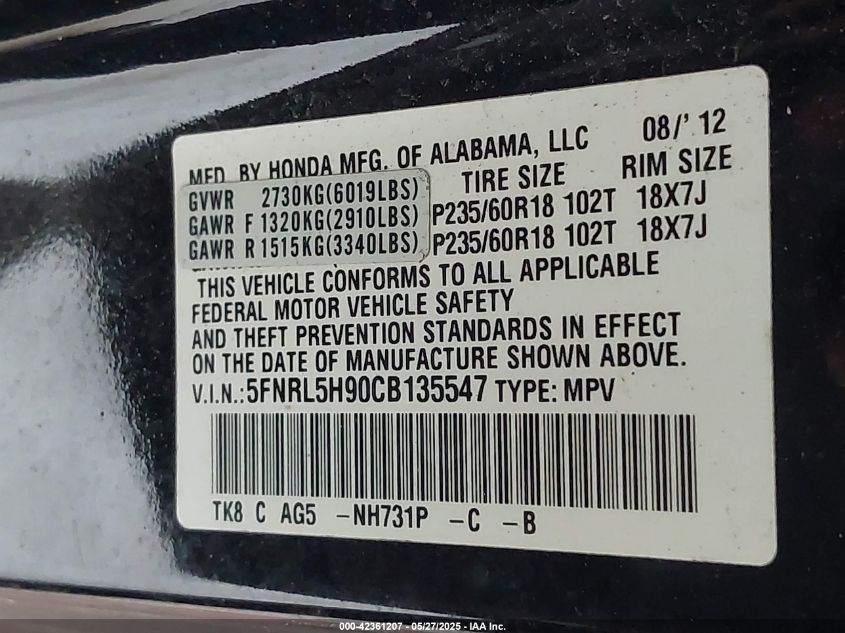 2012 HONDA ODYSSEY - 5FNRL5H90CB135547, цвет - Черный, 3.5, Бензин, Передний привод из США